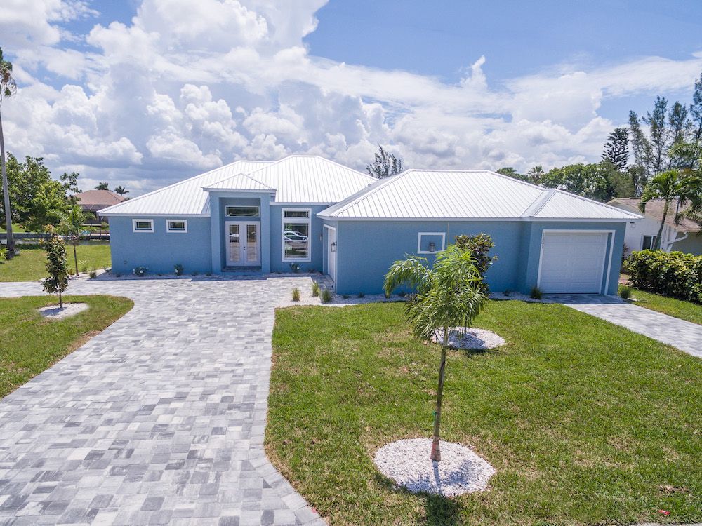 Notable features: Metal roof, impact glass, transom windows, 3rd car garage design, luxury vinyl plank flooring, upgraded custom shower tiles, custom cabinetry, hand selected granite tops, wine refrigerator in kitchen island, saltwater pool with spa, and a circular paver driveway.