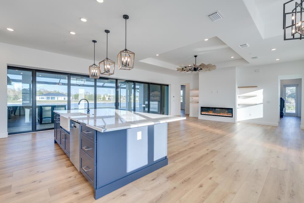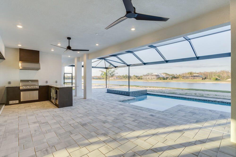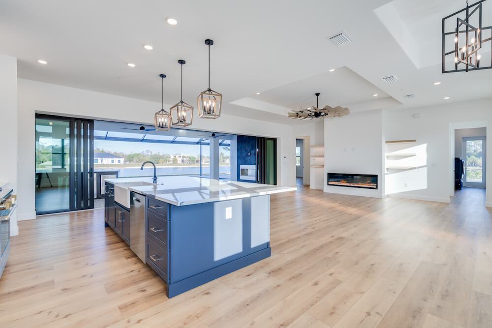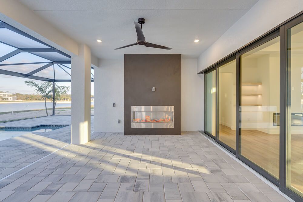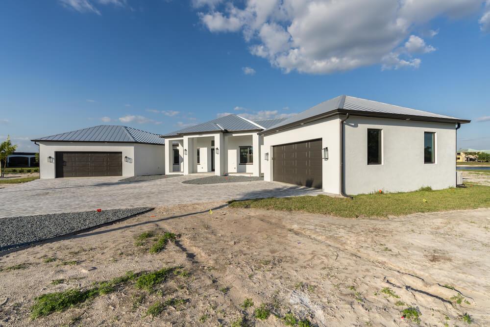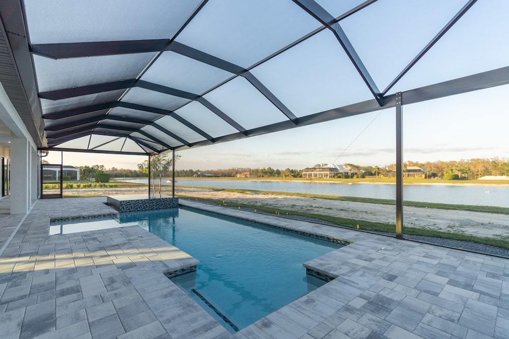 Barefoot ski Lake custom home. This beautiful home is located on a private ski lake community in Estero Florida. It has a very unique design with 2 oversized estate garages, 3 bedrooms, 3 baths, office, mud room plus utility room, 2600 sf living area with 1600 sf garage space, outdoor living featuring custom pool with spillover spa, fire place and outdoor kitchen, custom kitchen and baths, inside fireplace and many other features to list.