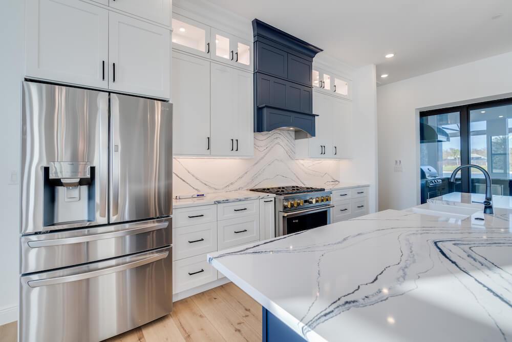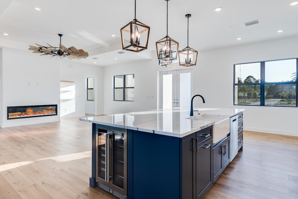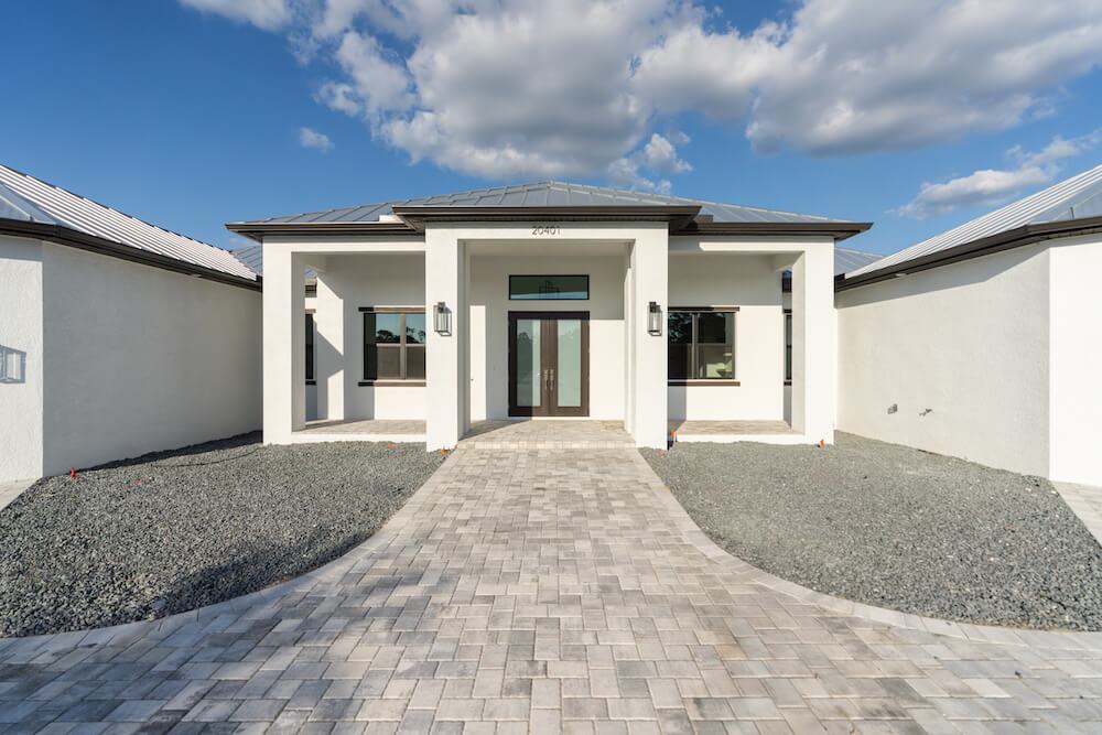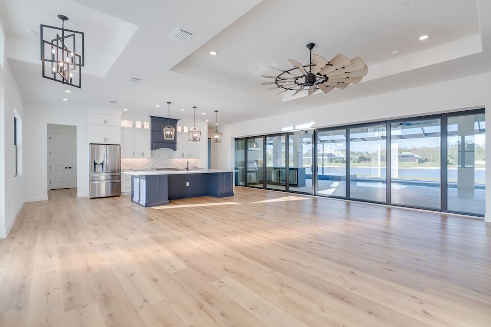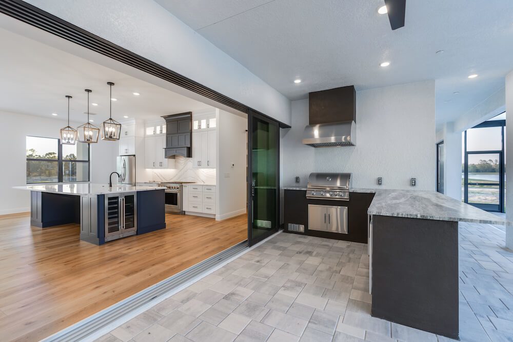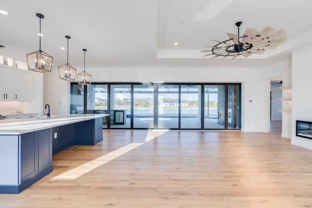 Barefoot ski Lake custom home. This beautiful home is located on a private ski lake community in Estero Florida. It has a very unique design with 2 oversized estate garages, 3 bedrooms, 3 baths, office, mud room plus utility room, 2600 sf living area with 1600 sf garage space, outdoor living featuring custom pool with spillover spa, fire place and outdoor kitchen, custom kitchen and baths, inside fireplace and many other features to list.