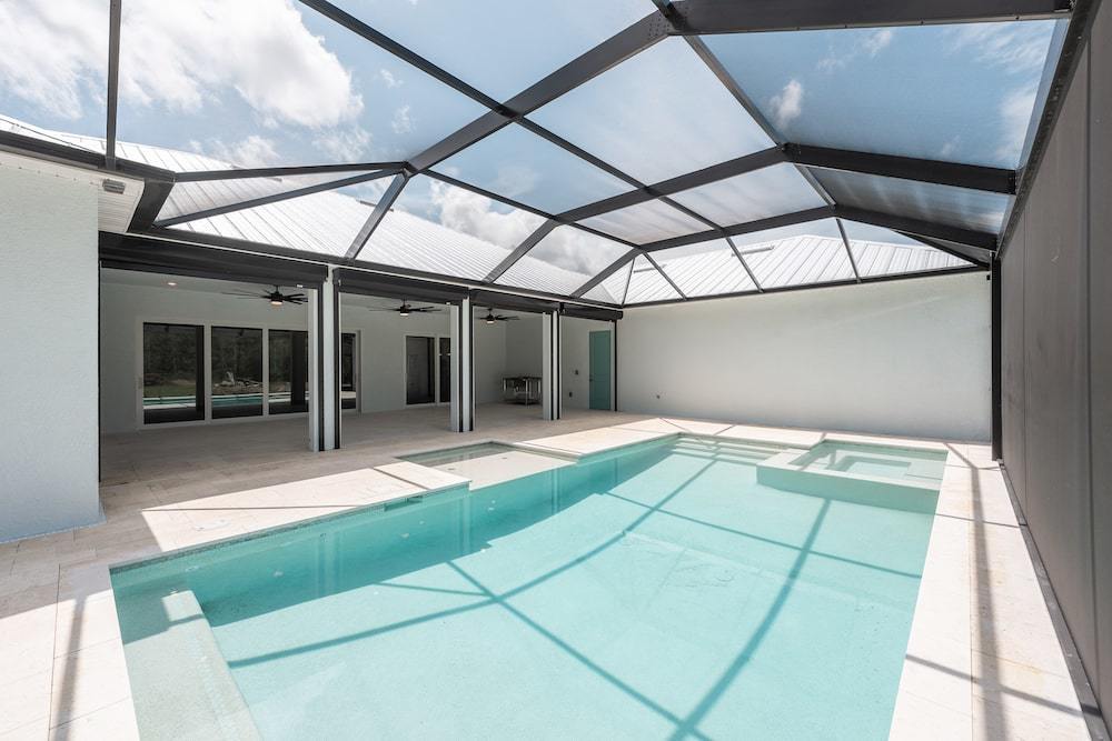 Step outside to your private oasis: a stunning pool and spa with a sunken spa, all set on a beautiful Shell Lock paver deck, perfect for relaxing or entertaining year-round. For your peace of mind and long-term durability, the home features a sleek and resilient metal roof.
