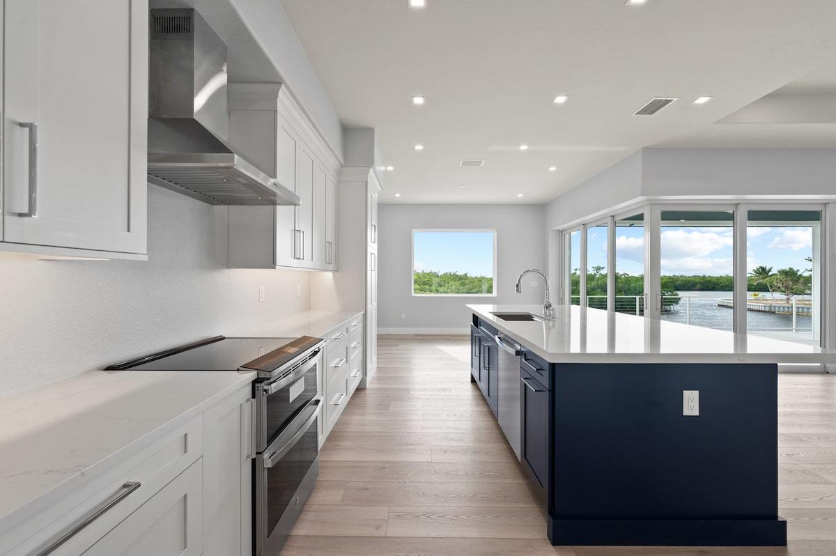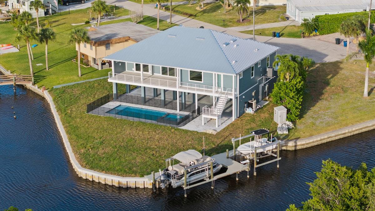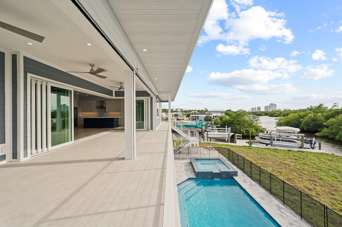 Our Dolphin St. project located in Estero, Florida is a custom Michaela plan elevated on piers and set on a piling and grade beam foundation. The plan is a 3 bedroom plus office Great Room style floor plan with 3 full baths. The lanai is extended and elevated with a view of the custom pool/spa below as well as the salt-water gulf access canal. The home is adorned from head to toe with many custom finishes selected to compliment the lifestyle of our wonderful owners. The custom cabinetry, counter tops, shower finishes as well as the flooring were all hand selected as part of our awesome color selection meetings! The pool is designed with an elevated spa with granite spillway. Every feature was hand selected through our design/build process and it shows in the beautiful finshed product.